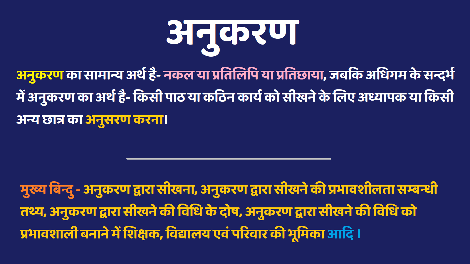 अनुकरण शब्द यूनानी भाषा के Mimesis (मिमेसिस) के समानार्थी रूप में प्रयुक्त हुआ है। ‘मिमेसिस’ का अंग्रेजी अनुवाद है – ‘Imitation’। हिन्दी में अनुकरण अंग्रेजी के Imitation शब्द से रूपान्तर होकर आया है। अनुकरण का सामान्य अर्थ है- नकल या प्रतिलिपि या प्रतिछाया, जबकि अधिगम के सन्दर्भ में अनुकरण का अर्थ है- किसी पाठ या कठिन कार्य को सीखने के लिए अध्यापक या किसी अन्य छात्र का अनुसरण करना।