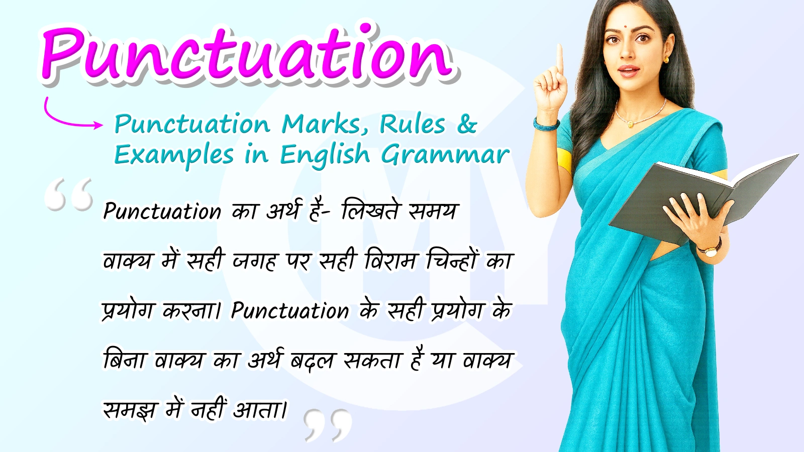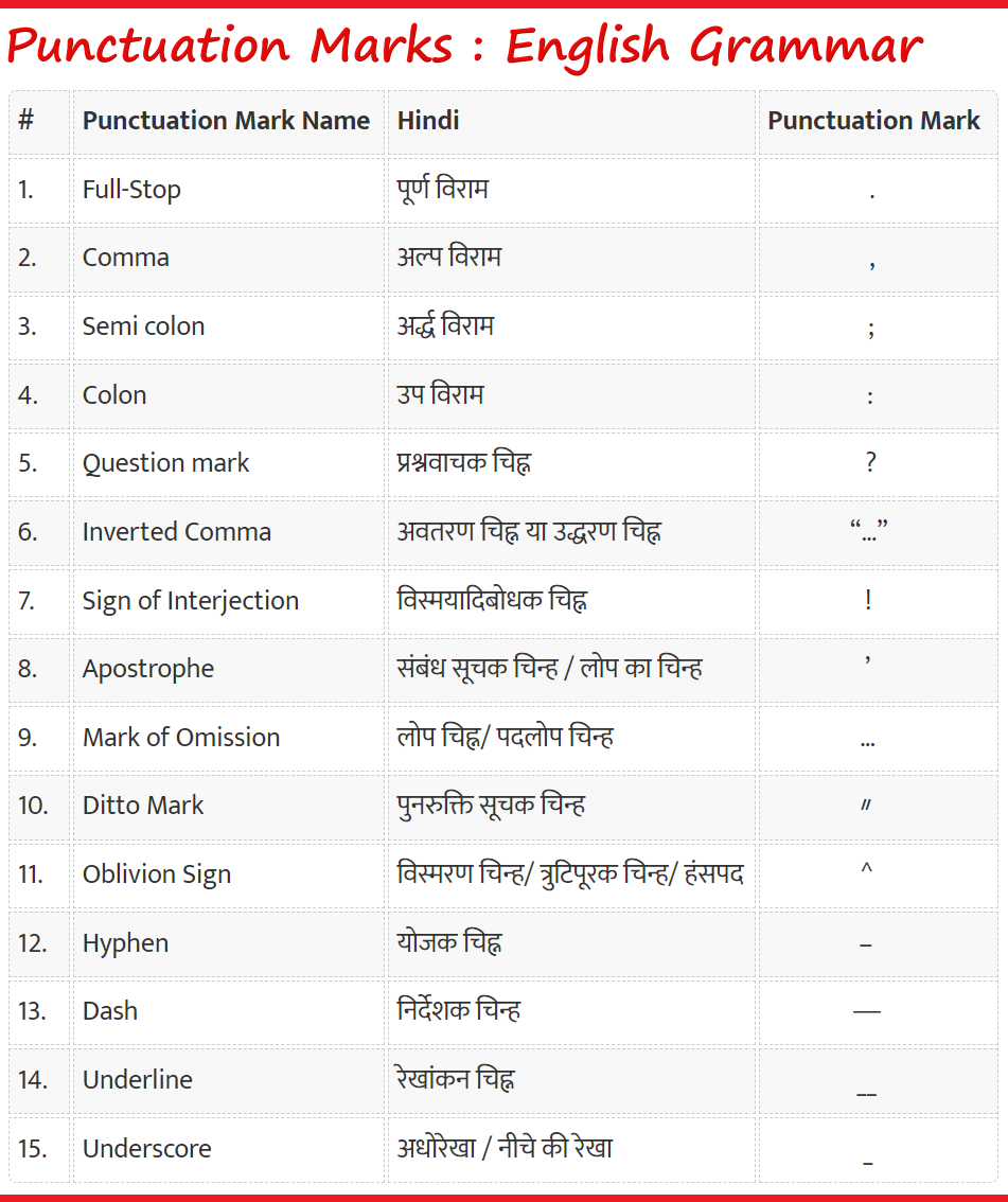 Punctuation (विराम-चिह्न-विधान): English में लिखते समय उचित विराम चिन्हों के प्रयोग को ‘Punctuation’ कहते है।